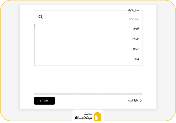 در مرحله بعد، اطلاعات فردی و شرایط متقاضی وارد میشود تا استعلام قیمت و مقایسه بیمهها انجام گردد. اطلاعات را به دقت وارد کنید تا بیمهنامه به درستی صادر شود.