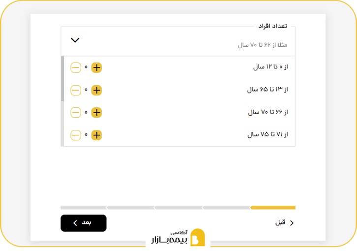 مرحله بعدی مشخص کردن تعداد افرادی است که تحت پوشش بیمه مسافرتی قرار می‌گیرند. این عدد شامل بزرگسالان و کودکان می‌شود و تاثیر مستقیم بر هزینه نهایی بیمه دارد. وارد کردن تعداد دقیق افراد باعث می‌شود حق بیمه به درستی محاسبه و هر نفر از پوشش کامل بیمه برخوردار شود. علاوه بر این، در سفرهای گروهی یا خانوادگی، بالا بودن تعداد افراد، امکان دریافت تخفیف‌ خرید گروهی یا بسته‌های ویژه (در برخی شرایط) را فراهم می‌کند.