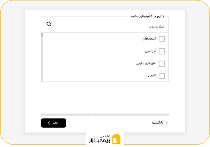 اولین مرحله در ثبت درخواست خرید بیمه مسافرتی در پنل شرکای بیمه بازار وارد کردن کشور یا کشورهای مقصد سفر است. این اطلاعات بسیار مهم است؛ چرا که نرخ حق بیمه و پوشش‌ها بر اساس موقعیت مکانی هر کشور متفاوت خواهد بود. برخی کشورها هزینه درمان بالاتری دارند و در نتیجه بیمه مسافرتی برای آن‌ها گران‌تر است. علاوه بر این، کشور مقصد تعیین کننده نوع پوشش‌های بیمه مسافرتی برای مشتری است. همچنین تعیین مقصد سفر به راهنمایی درباره نیاز به مدارک شناسایی خاص هم کمک زیادی می‌کند.